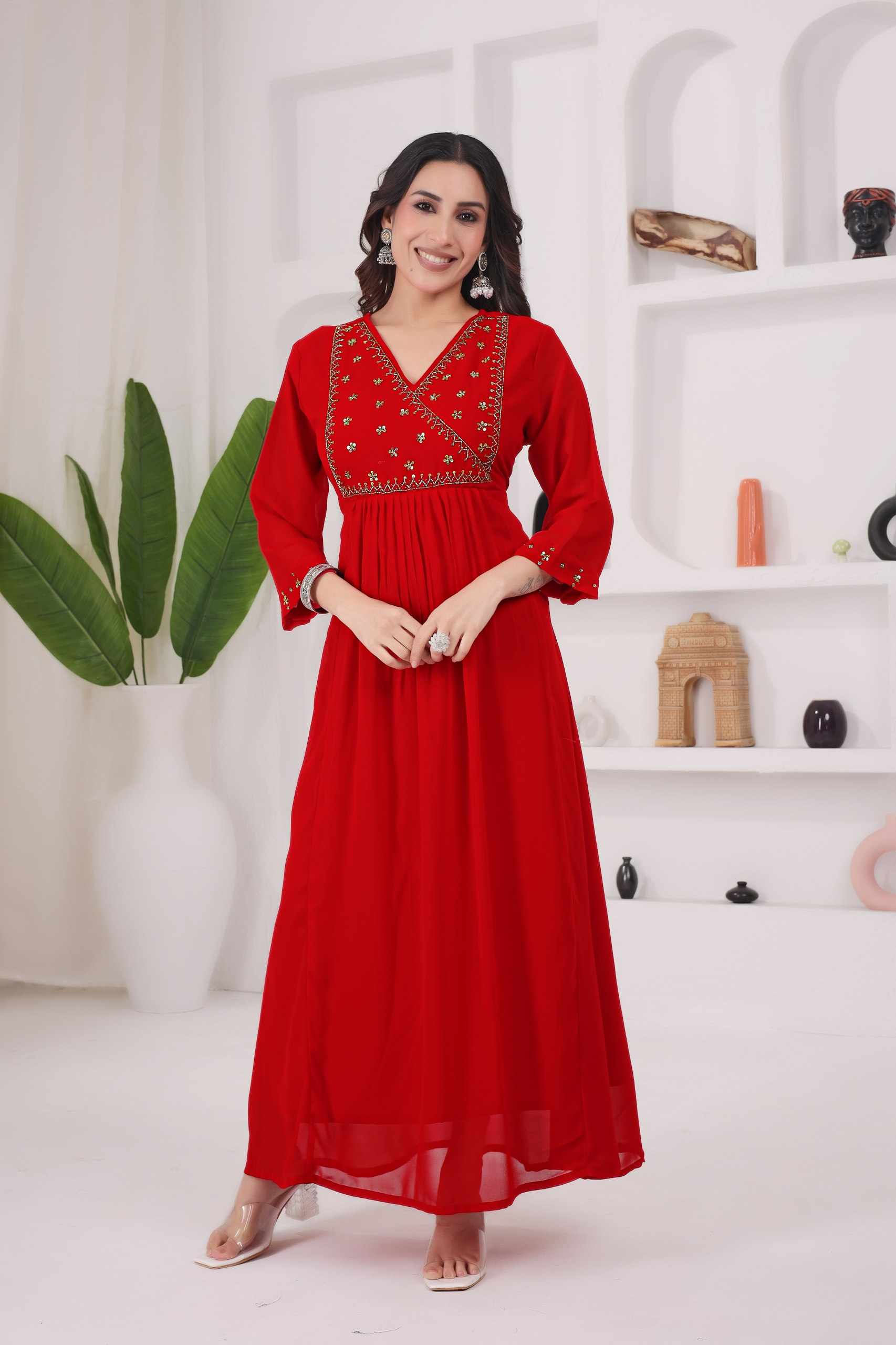 WM12 RED BLOOMING GEORGETTE BEAUTIFUL HANDWORK KURTI